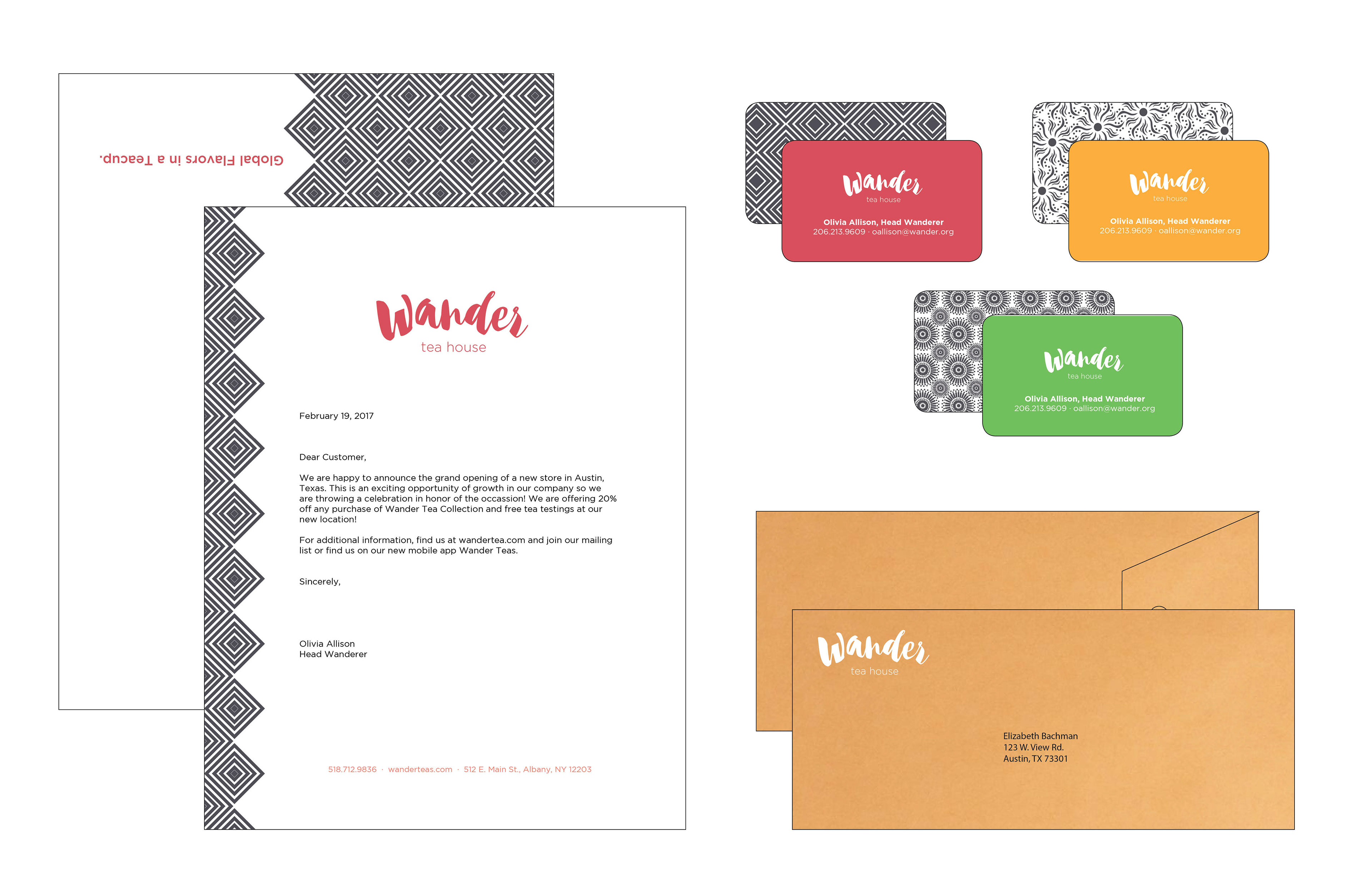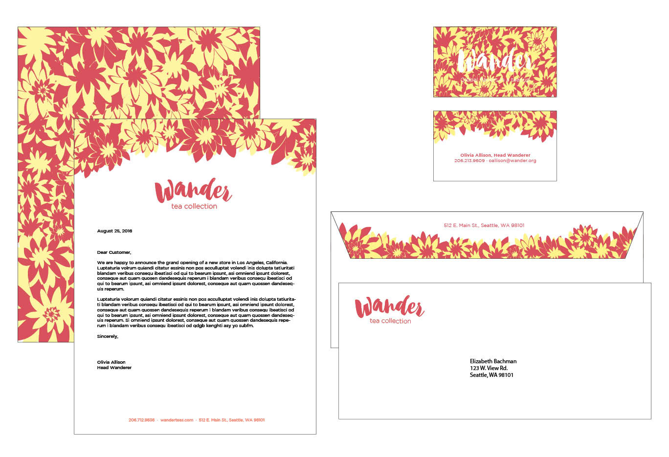 This stationary was designed for my fictional tea brand Wander Tea House. The stationary design was influenced by patterns from around the world and popular colors found in different cultures. Wander Tea House is designed to inspire a thirst for adventure, it only seems fitting the stationary should do the same.
